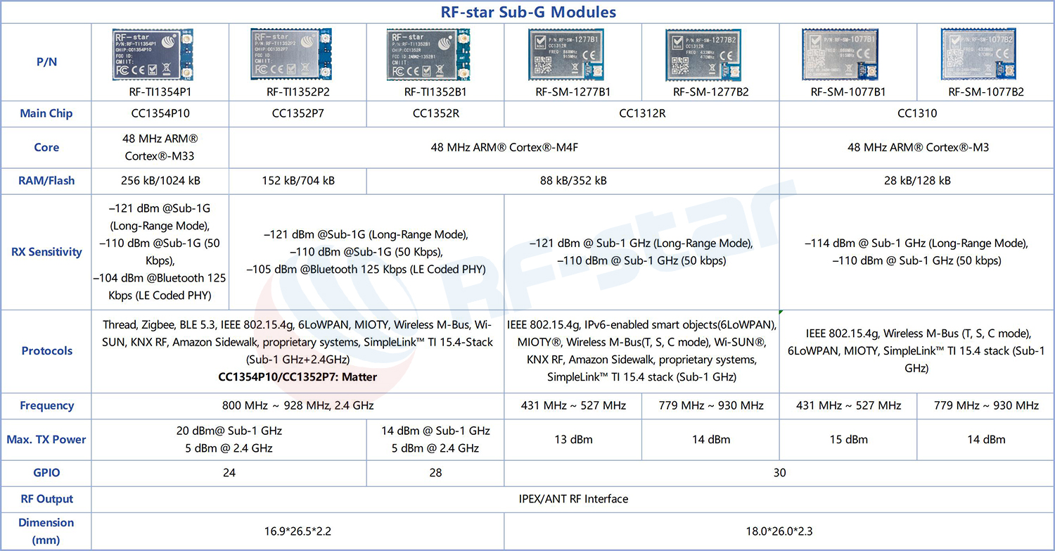 Alguns módulos Sub-G da RF-Star suportam operação simultânea em modo duplo (2,4 GHz + Sub-G) e também são compatíveis com diversos protocolos de comunicação, como Wi-SUN e protocolos proprietários. A mesma plataforma de hardware pode ser adaptada a diferentes requisitos de mercado e aplicação, reservando ainda amplo espaço para futuras atualizações de produto e expansão de recursos.